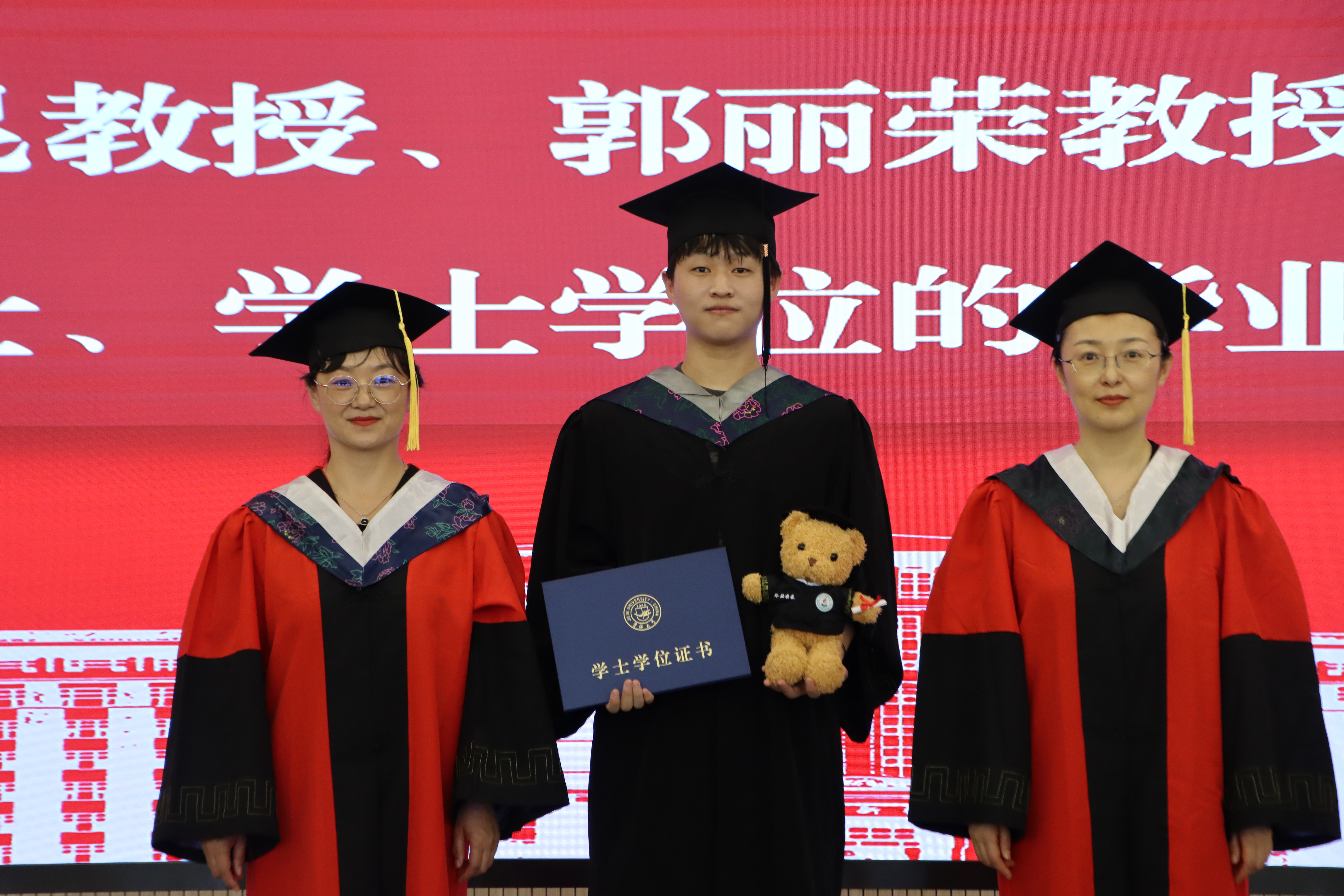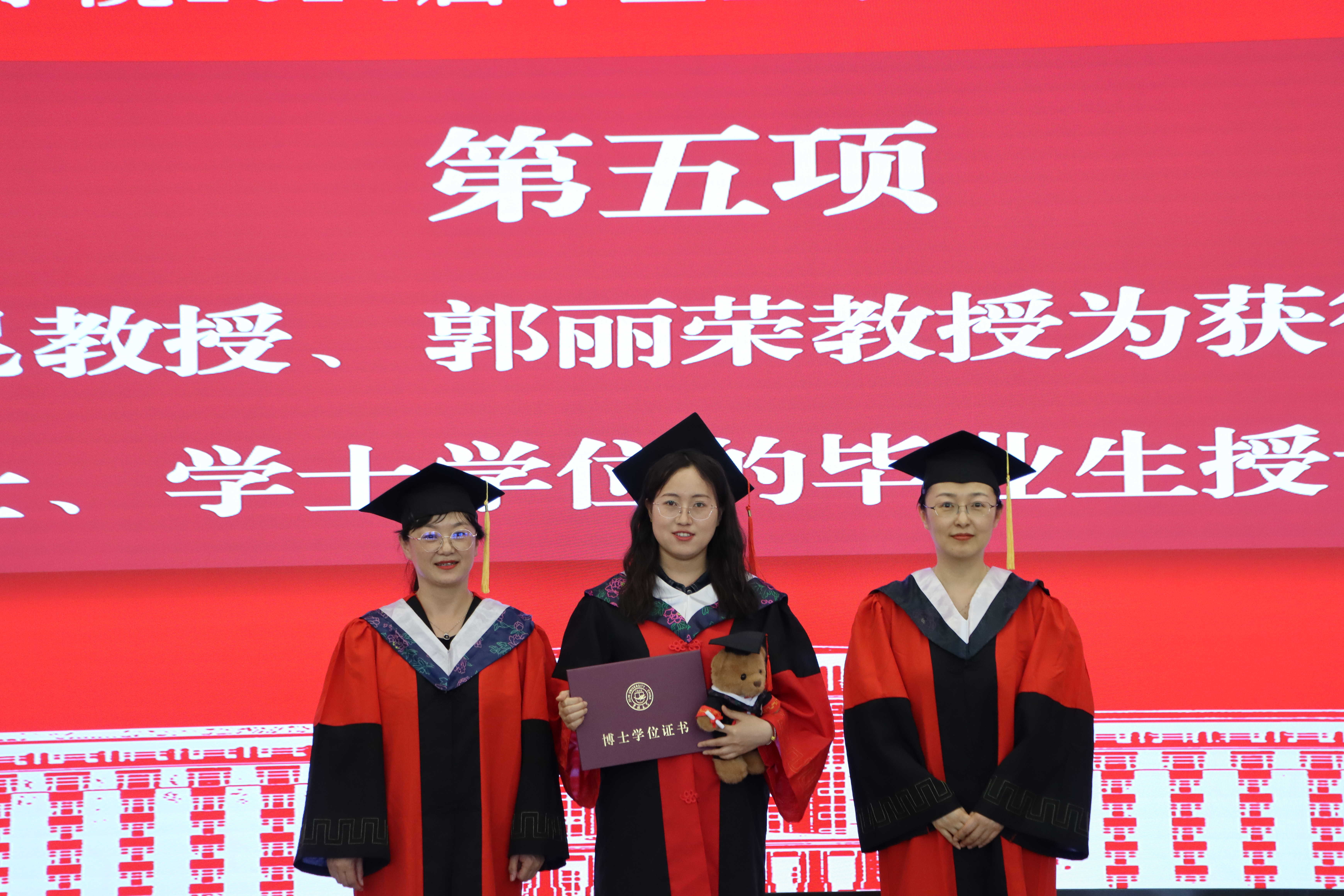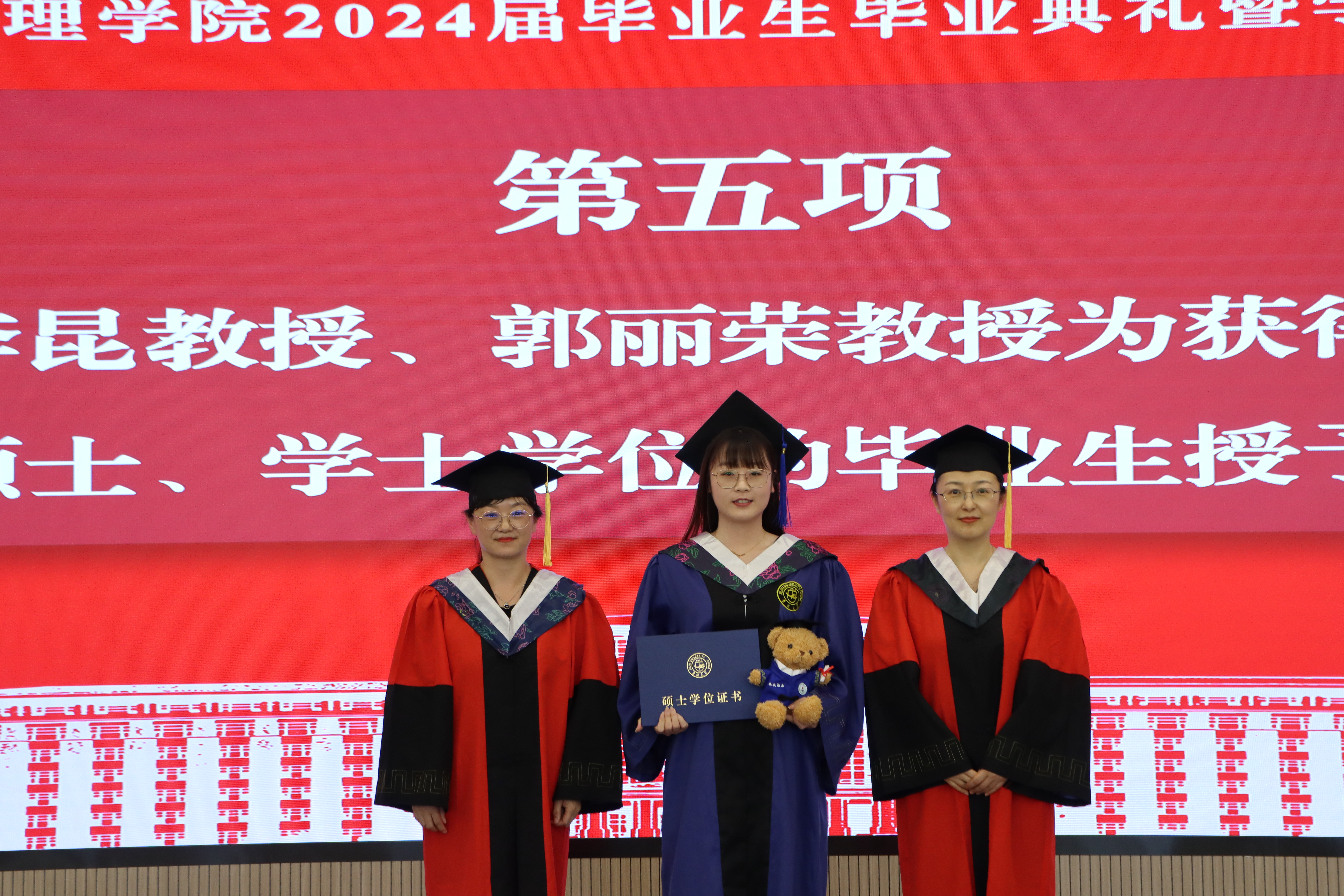 在学位授予仪式环节,beats365亚洲版官网副经理、学位评定分委员主席李昆老师,学术委员会主任郭丽荣老师为获得博士学位、硕士学位、学士学位的毕业生拨动流苏、授予学位并颁发学位证书。