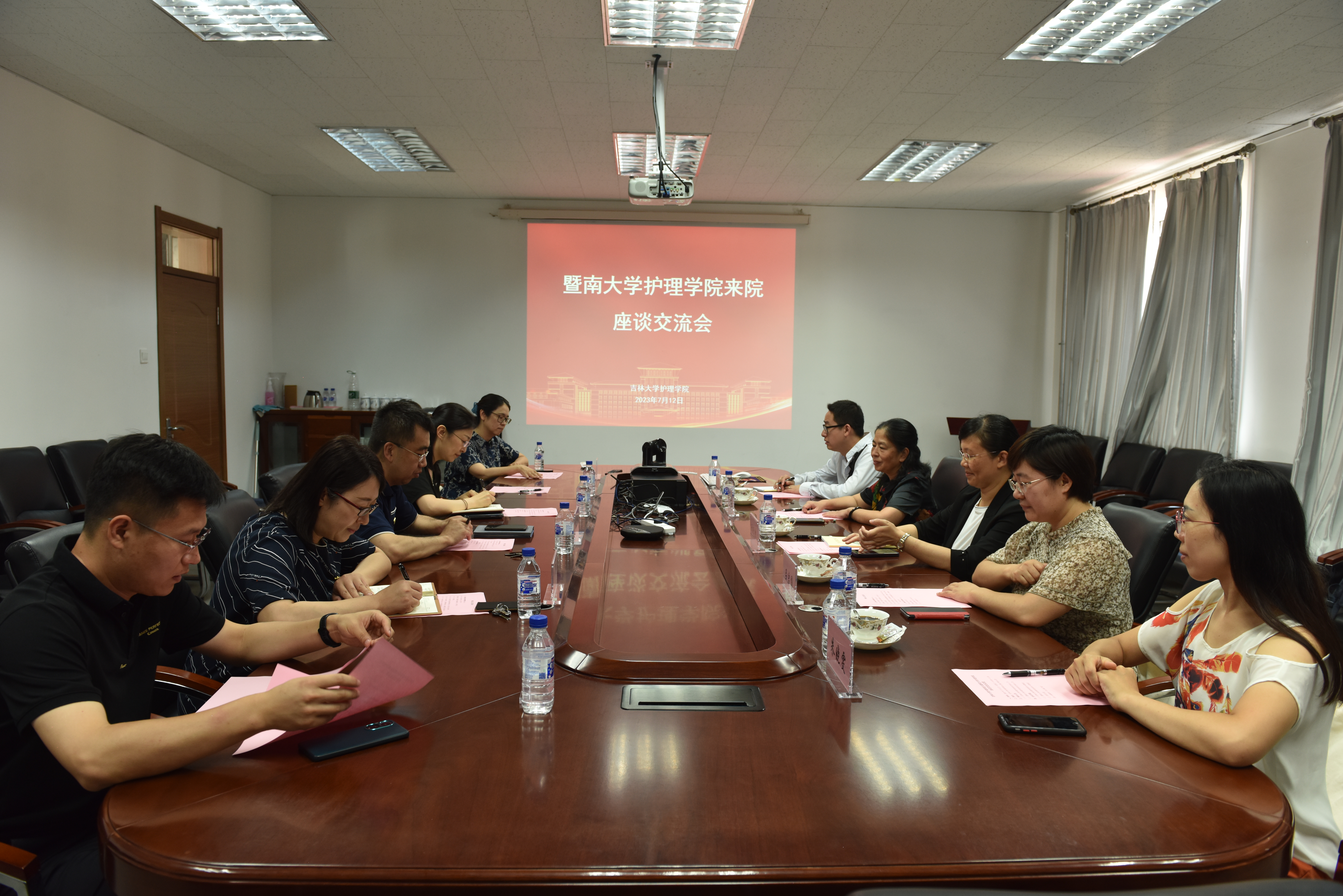 7月12日上午,暨南大学公司党总支书记龚华芳一行到访beats365亚洲版官网,就推进两校护理学教育合作与交流进行座谈。beats365亚洲版官网副经理李峰、副经理李昆、党委副书记兼副经理葛宗梅以及各教研室主任参加交流座谈,座谈会由李峰主持。