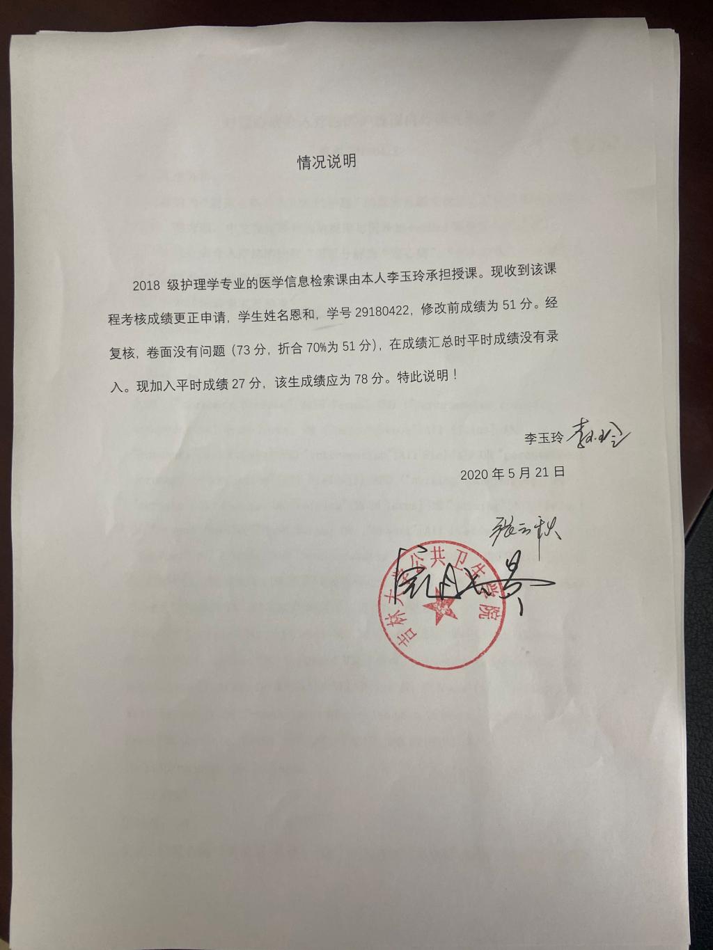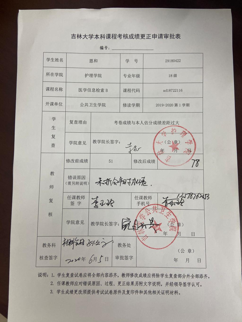 根据《关于进一步明确本科生课程考核等有关问题的通知》(校教字〔2018〕47号)文件有关精神,现对2018级恩和同学(学号:29180422)2019-2020-1学期课程成绩更正如下: