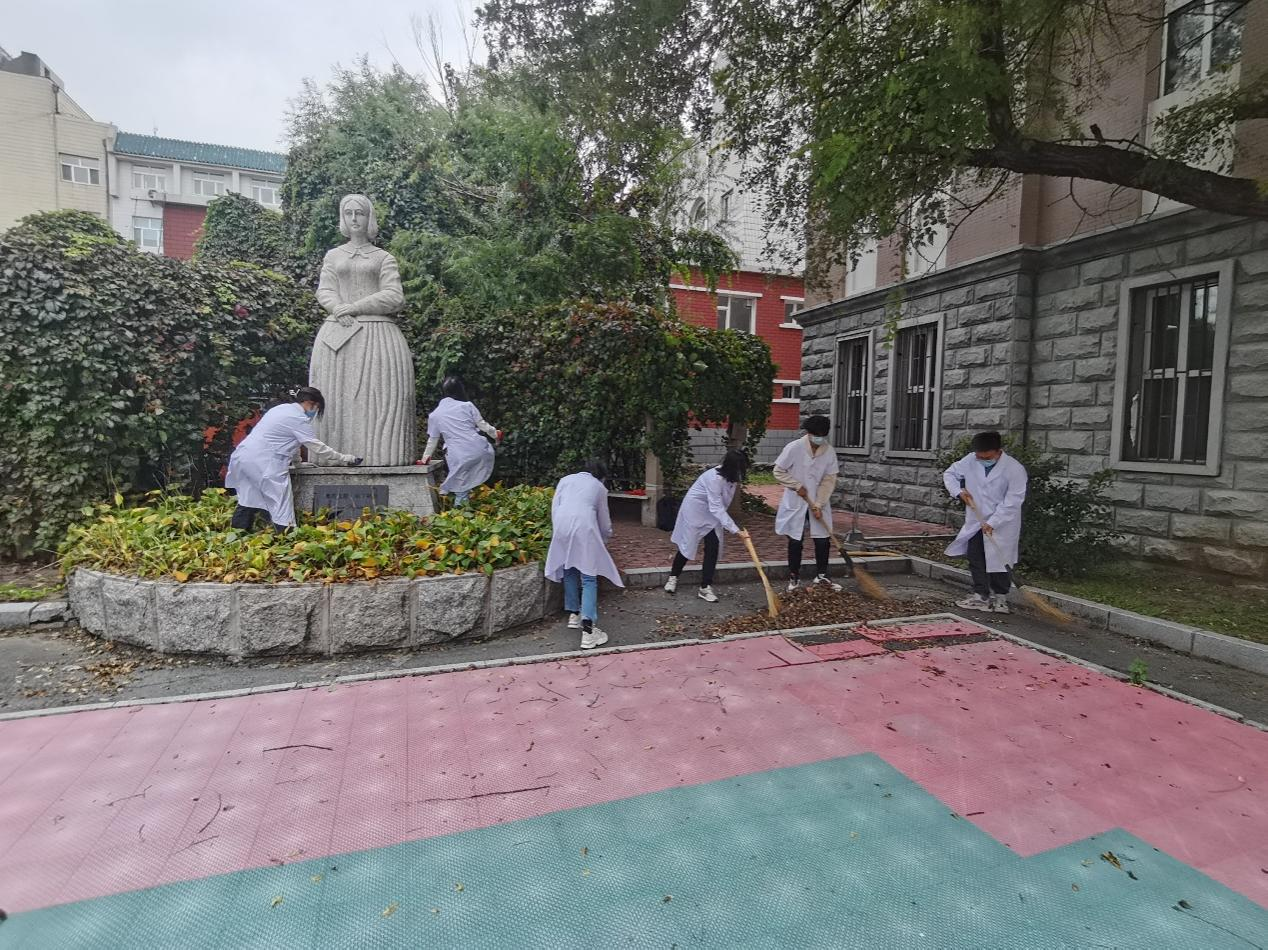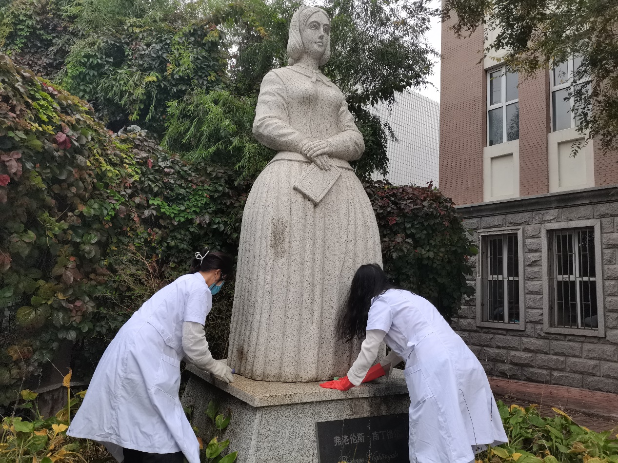 “拾步校园”劳动小队于2021年10月3日早晨8:30,在beats365亚洲版官网院内开展了以“清扫南丁格尔雕像”为主要内容的劳动实践活动,将十一黄金周变为金秋劳动周。秋风带着凉爽而来,也留下了落叶缤纷。“拾步校园”劳动小队带着清扫工具来到beats365亚洲版官网院内,为南丁格尔雕像拂去微尘,扫清其周围落叶,站在雕像面前默默纪念,内心重温南丁格尔 “终身纯洁,忠贞职守,竭诚协助医生之整治,务谋病者之福利”的誓言。用自己的亲身劳动来表达对“提灯女神”的最大敬意与无限哀思。